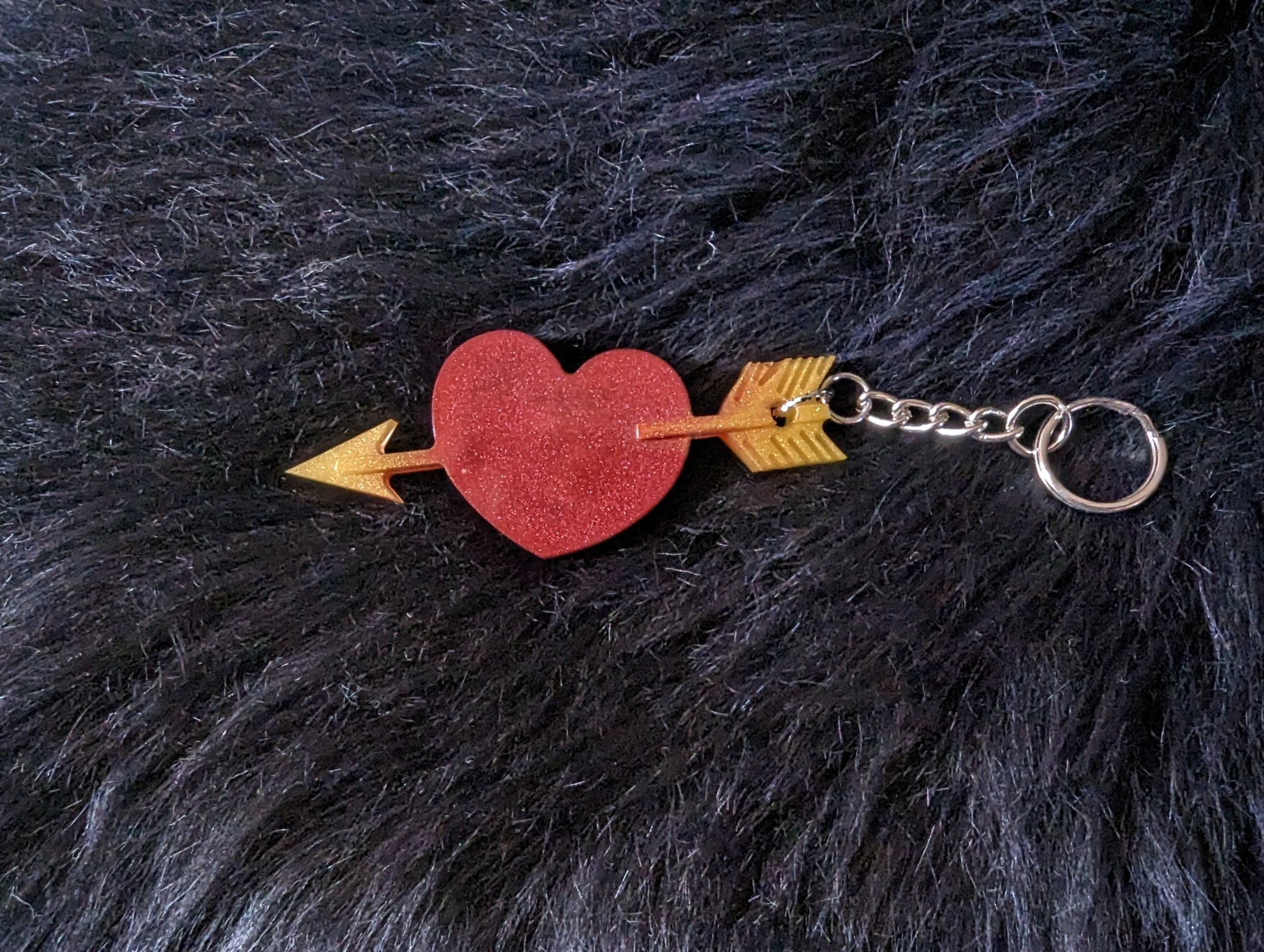 Small Heart and Arrow Keychain. This keychain is made of epoxy resin and mica powders. It is a lovely dark red heart with a nice golden arrow piercing it. Colors may differ slightly than shown on screen due to lighting and screen variations. This is a hand crafted item, so please allow some slight surface imperfections.