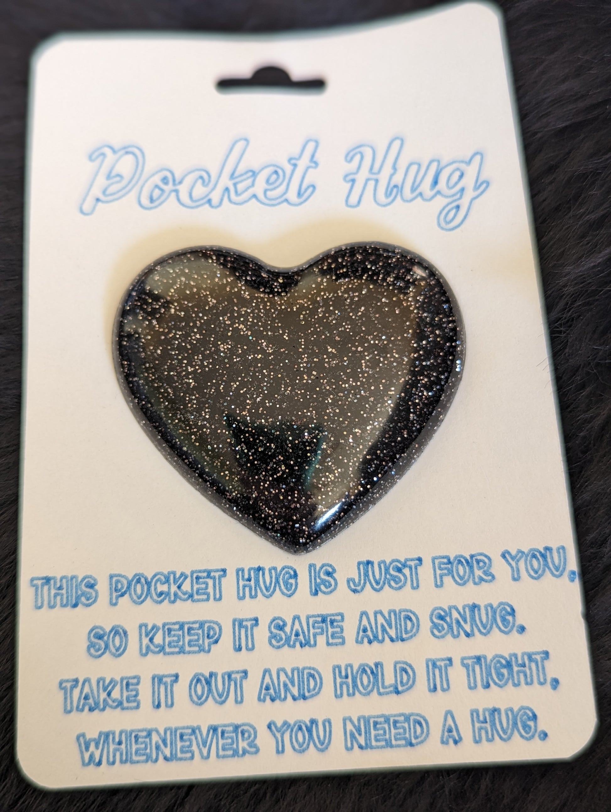 This pocket hug is just for you, so keep it safe and snug. Take it out and hold it tight, whenever you need a hug. This pocket heart is the perfect gift for loved ones that you maybe don't get to see very often, or that you just want to think about you. They can keep it in their pocket, and when they pull it out they can think of you and hold you close. This particular heart shaped pocket hug is approximately 2"x2", so it is a rather large pocket hug. It is made of epoxy resin, mica powder and glitter. This pocket hug is made with black glitter. Color may differ slightly in person due to lighting and variances in screens. This is a hand crafted item, please allow slight surface imperfections.