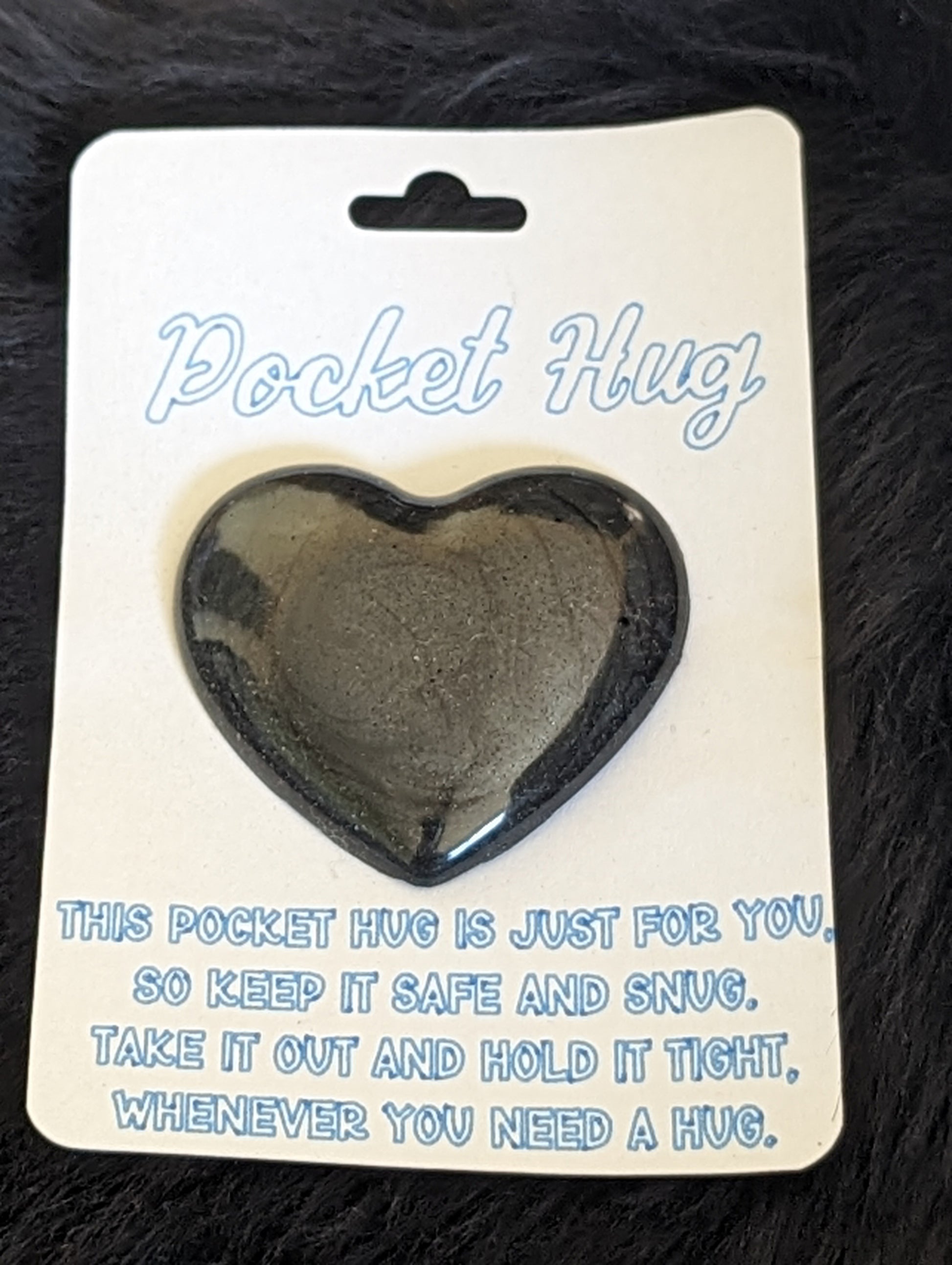 This pocket hug is just for you, so keep it safe and snug. Take it out and hold it tight, whenever you need a hug. This pocket heart is the perfect gift for loved ones that you maybe don't get to see very often, or that you just want to think about you. They can keep it in their pocket, and when they pull it out they can think of you and hold you close. This particular heart shaped pocket hug is approximately 2"x2", so it is a rather large pocket hug. It is made of epoxy resin, mica powder and glitter. This pocket hug is made with charcoal black mica powder. Color may differ slightly in person due to lighting and variances in screens. This is a hand crafted item, please allow slight surface imperfections.