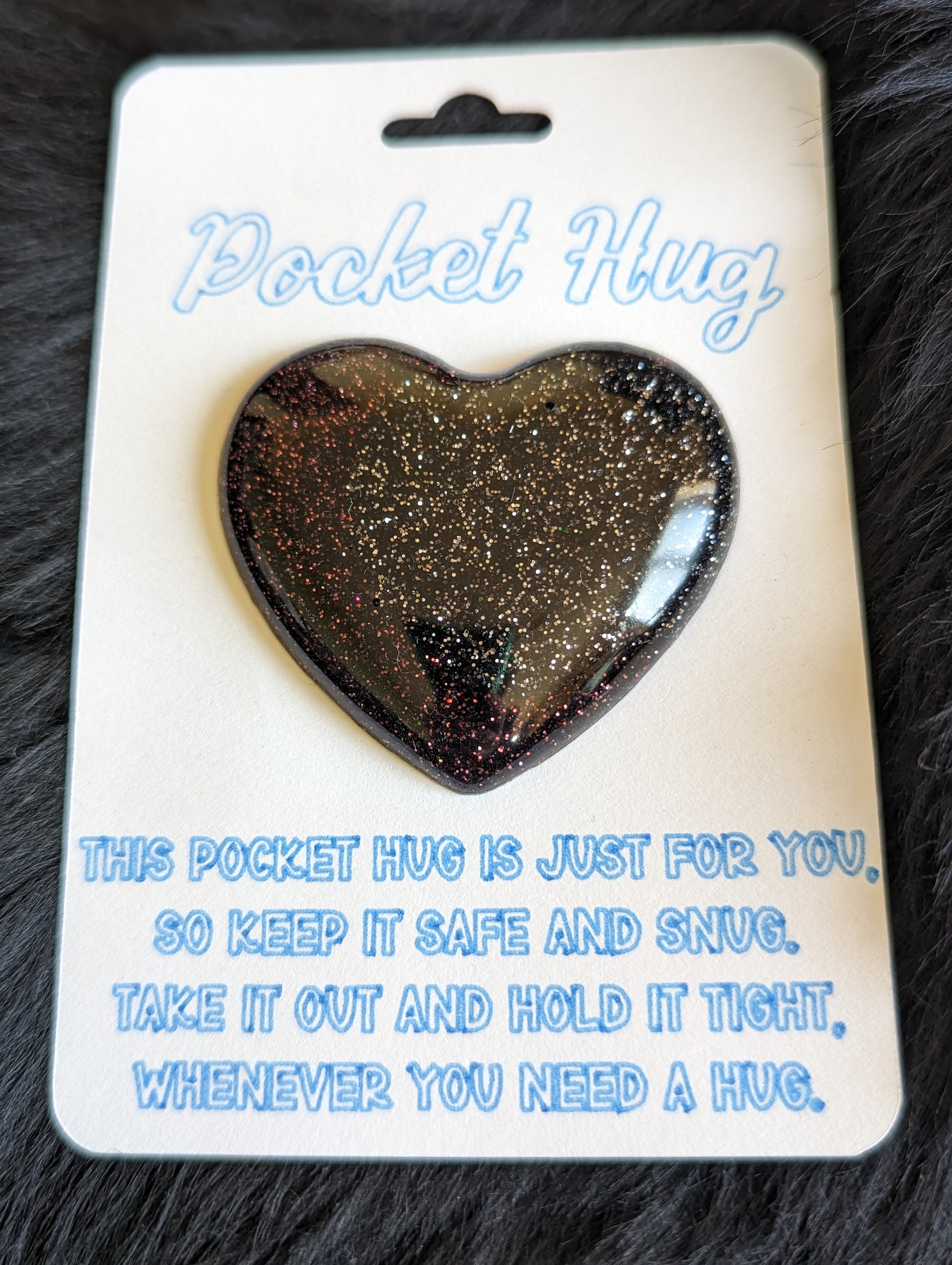 This pocket hug is just for you, so keep it safe and snug. Take it out and hold it tight, whenever you need a hug. This pocket heart is the perfect gift for loved ones that you maybe don't get to see very often, or that you just want to think about you. They can keep it in their pocket, and when they pull it out they can think of you and hold you close. This particular heart shaped pocket hug is approximately 2"x2", so it is a rather large pocket hug. It is made of epoxy resin, mica powder and glitter. This pocket hug is made with black glitter on one half, and a dark red glitter in the other half. Color may differ slightly in person due to lighting and variances in screens. This is a hand crafted item, please allow slight surface imperfections.