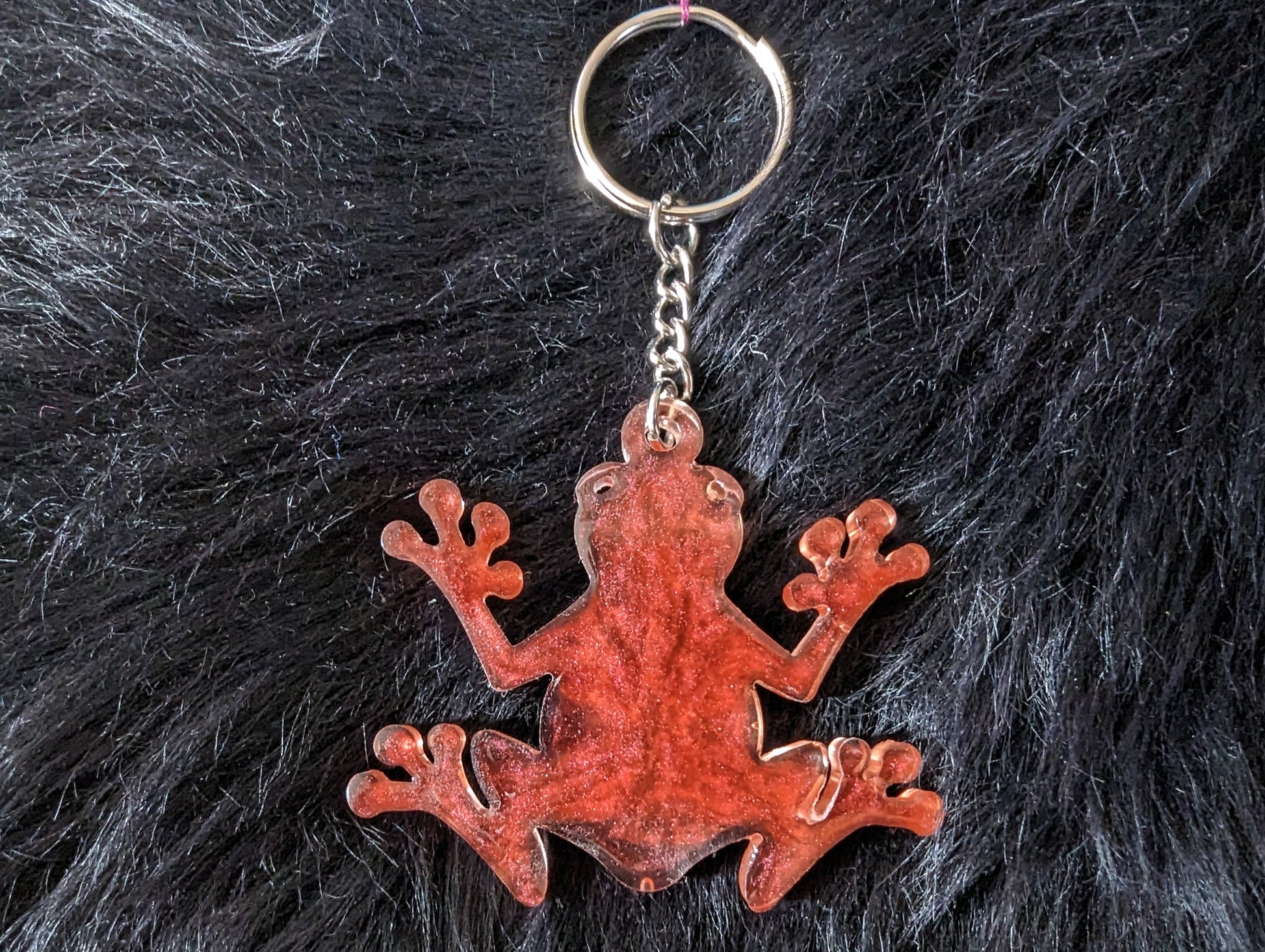 Small TreeFrog Keychain. This keychain is made of epoxy resin and mica powders. It is a lovely dark red. Colors may differ slightly than shown on screen due to lighting and screen variations. This is a hand crafted item, so please allow some slight surface imperfections.